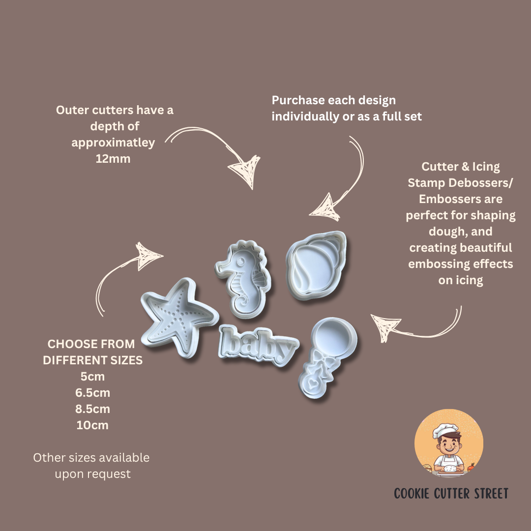 Celebrate new beginnings with our beautiful Under The Sea Themed Baby Shower Cookie Cutters & Icing Embossers set, designed especially for "Baby" themed occasions. These thoughtfully detailed cutters are perfect for creating elegant cookies, fondant cupcake toppers, or clay embellishments to suit baby showers, gender reveals, or welcoming a new arrival.